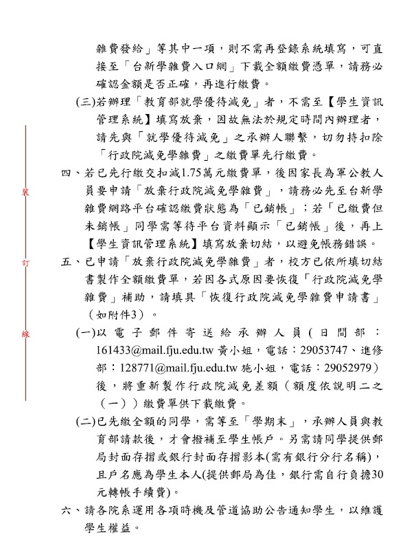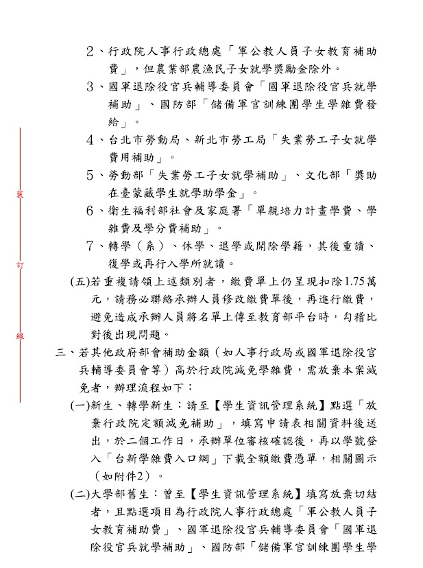 公告本校114學年度第2學期「行政院減免學雜費」注意事項
