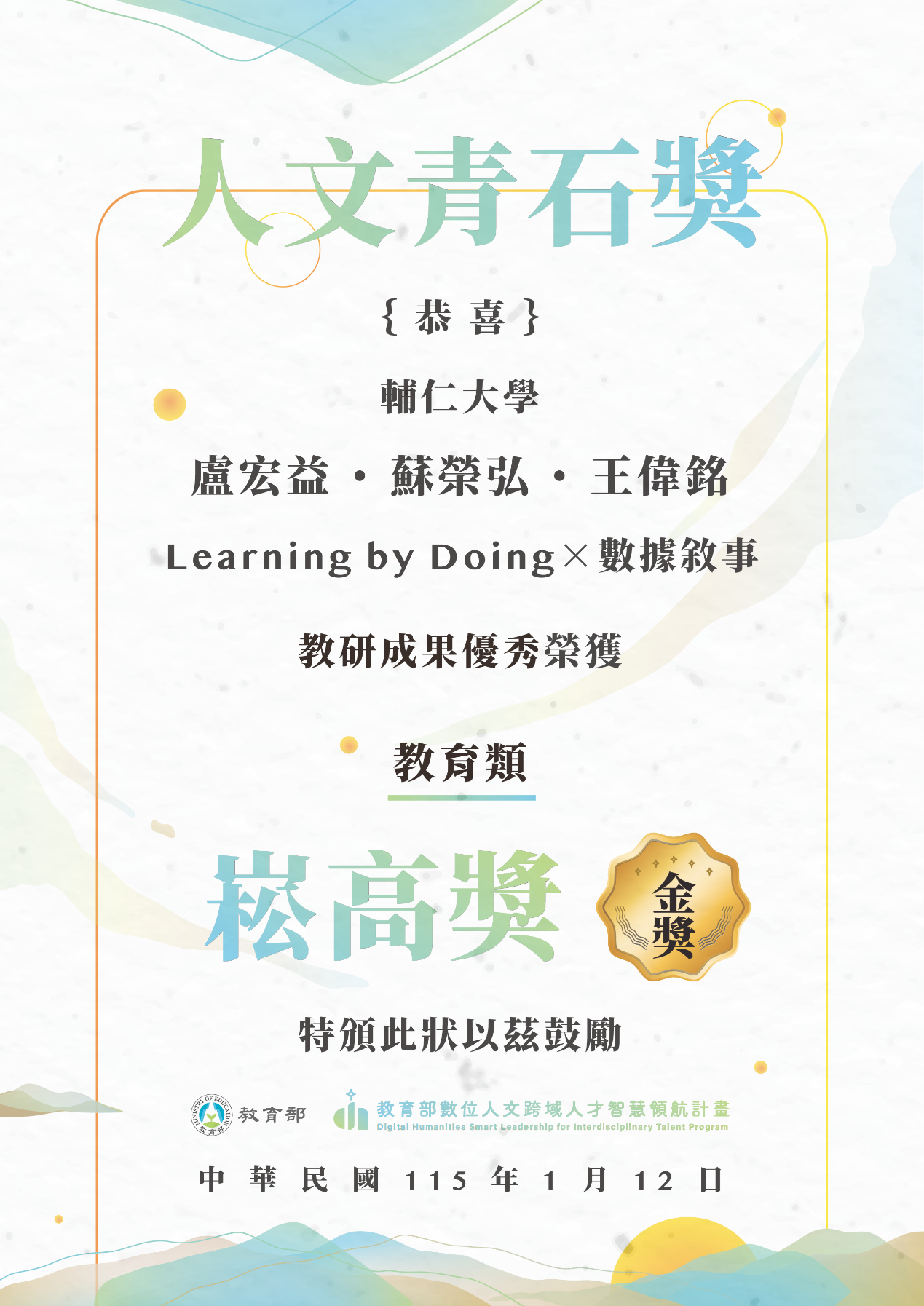 本系盧宏益、蘇榮弘、王偉銘 三位教師,憑藉教學實踐成果 「Learning by Doing × 數據敘事」,榮獲 2025 年人文青石獎教育類—崧高獎(金獎),展現長期深耕人文素養教育的卓越成效。
