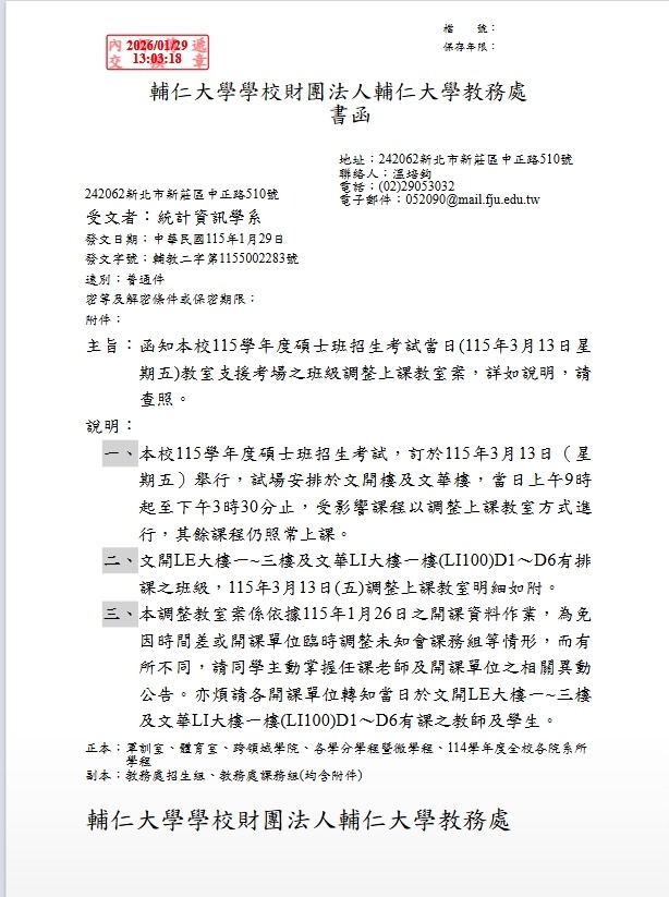 函知本校115學年度碩士班招生考試當日(115年3月13日星期五)教室支援考場之班級調整上課教室案,詳如說明,請查照。