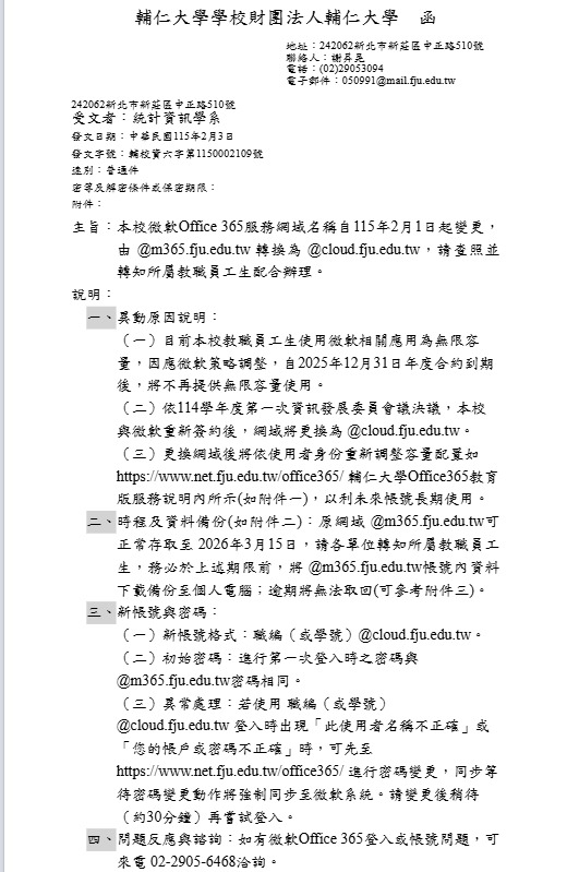本校微軟Office 365服務網域名稱自115年2月1日起變更,由 @m365.fju.edu.tw 轉換為 @cloud.fju.edu.tw,請查照並轉知所屬教職員工生配合辦理。