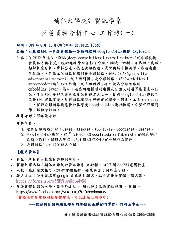 大數據GPU平行運算體驗--分類網路與Google Colab概述 (Pytorch)~ 專任教師 邵皓強老師