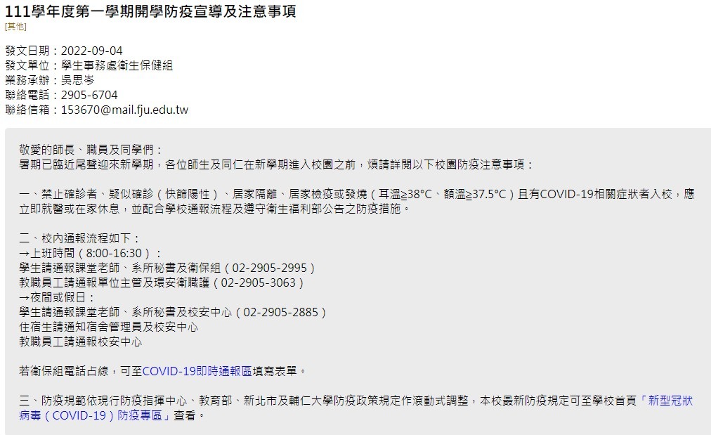 五、防疫規劃依據疫情狀況與主管機關指引滾動調整,將即時公告於本校首頁防疫專區,敬請留意防疫專區訊息公告。如有未盡事項,悉依教育部、CDC與本校防疫小組決議辨理。