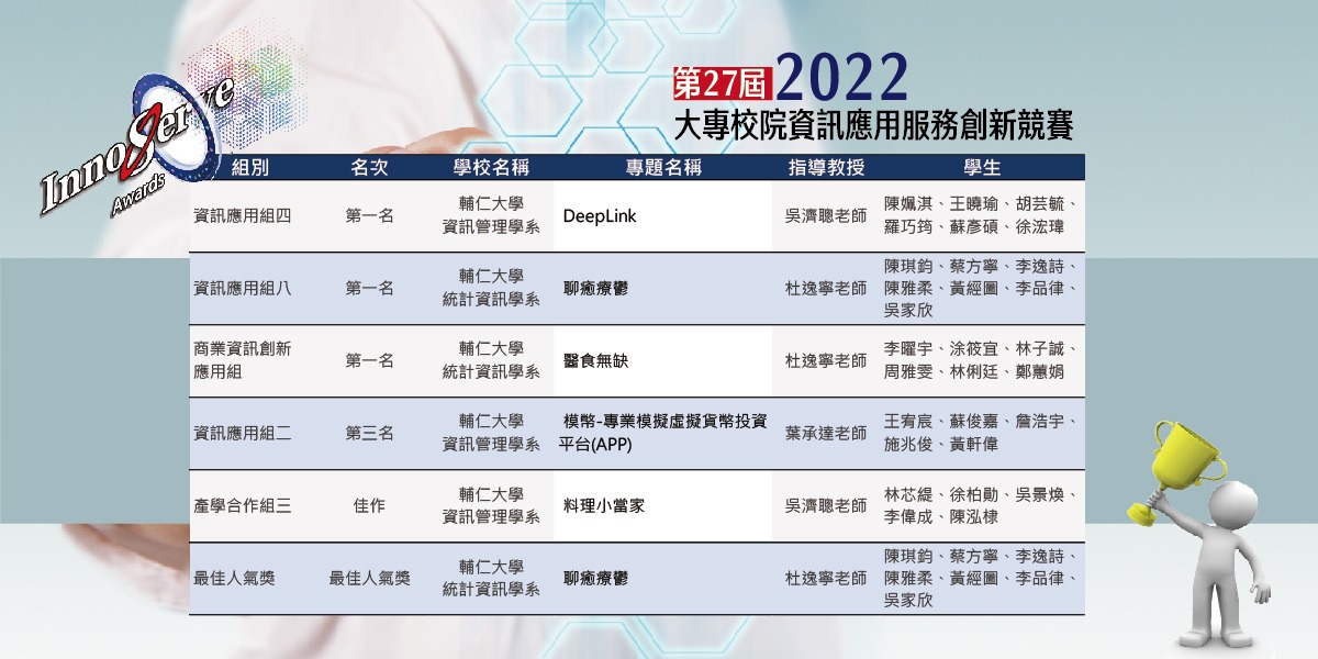 全臺灣規模最大、參與人數最多的資訊競賽活動「2022大專校院資訊應用服務創新競賽」已邁入第27年,決賽在11月5日於國立臺灣大學綜合體育館登場,吸引7個亞太經濟體代表隊,969隊次,共5020人次報名。 決賽邀請近140位產官學專家擔任評審,從375個決賽團隊、約2,000人次中評選出最終的得獎作品,競爭相當激烈。輔仁大學管理學院資訊管理學系及統計資訊學系五個團隊共獲得六項大獎。