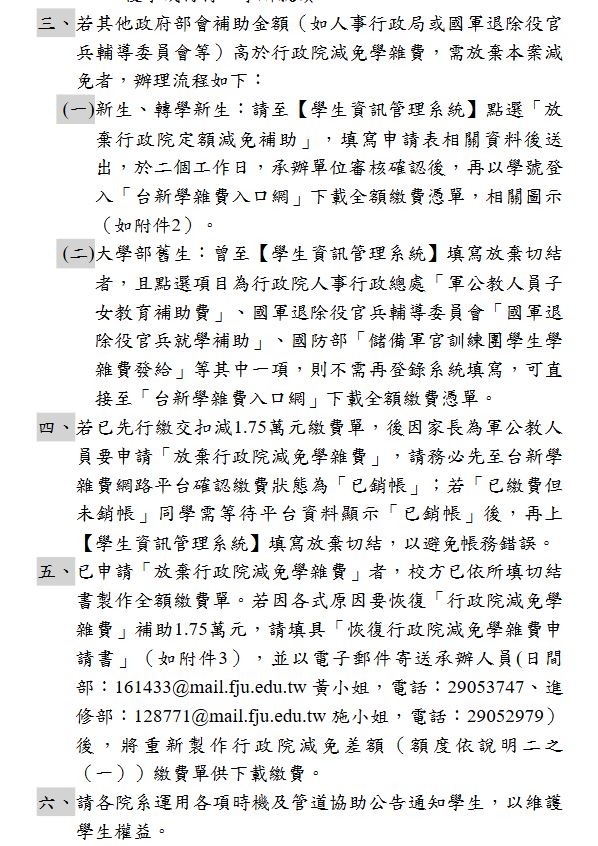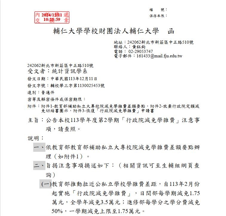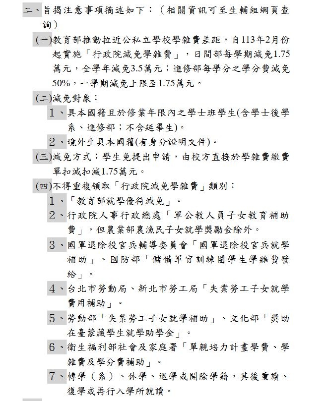 公告本校113學年度第2學期「行政院減免學雜費」注意事項,請查照。