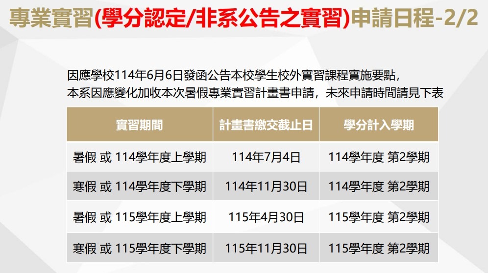 為協助同學了解最新規定,凡有意於未來選修專業實習課程者,請務必參加本次說明會: