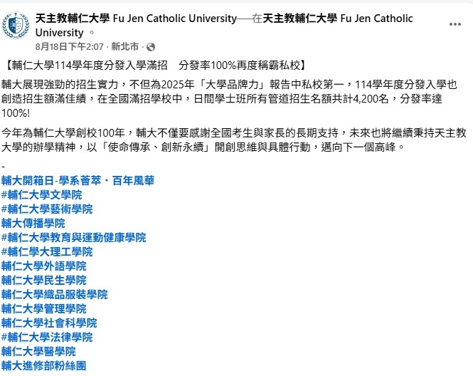 輔仁大學114學年度分發入學滿招 分發率百分百~再度稱霸私校