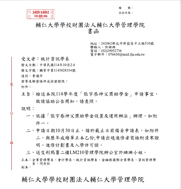 檢送管院114學年度「張宇恭神父獎助學金」申請事宜,敬請協助公告周知,請查照。