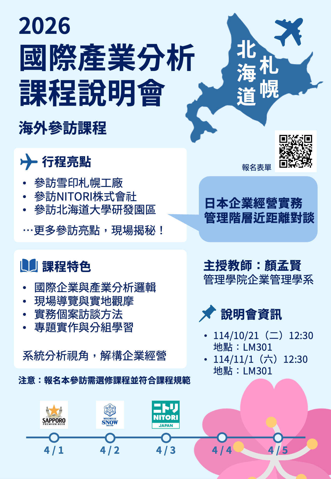 2026年春季,我們將前往日本北海道,參訪在地企業、大學及官方機構,實地觀察日本在地產業發展與國際化歷程,邀請有興趣的同學參加課程說明會瞭解詳情!