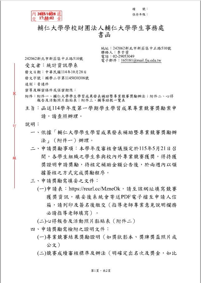 函送114學年度第一學期學生學習成果專業競賽獎勵案申請,請查照辦理。