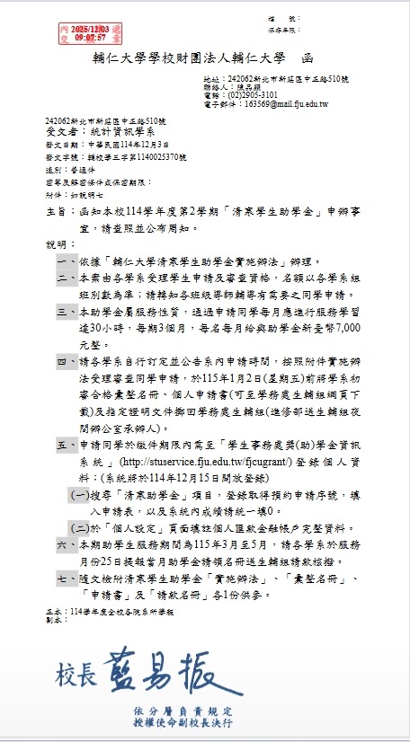114-2學期 清寒助學金申請期間於114/12/15至115/1/2止。
